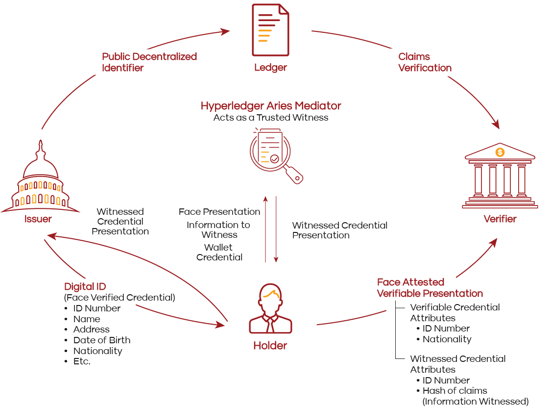 When an Issuer needs to provide a Face Verified Credential to the Holder, a Verifiable Presentation of a Witnessed Credential is requested. This Witnessed Credential, containing a hash of the Issuer’s connection ID, can only be issued by a Trusted Witness upon a Verifiable Presentation of the Wallet Credential along with a live facial image as a self-attested attribute.